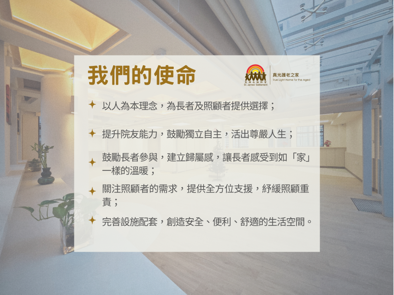 讓每位長者都生活在一個舒適安全的環境,有尊嚴、互動、充滿愛地享受安老。